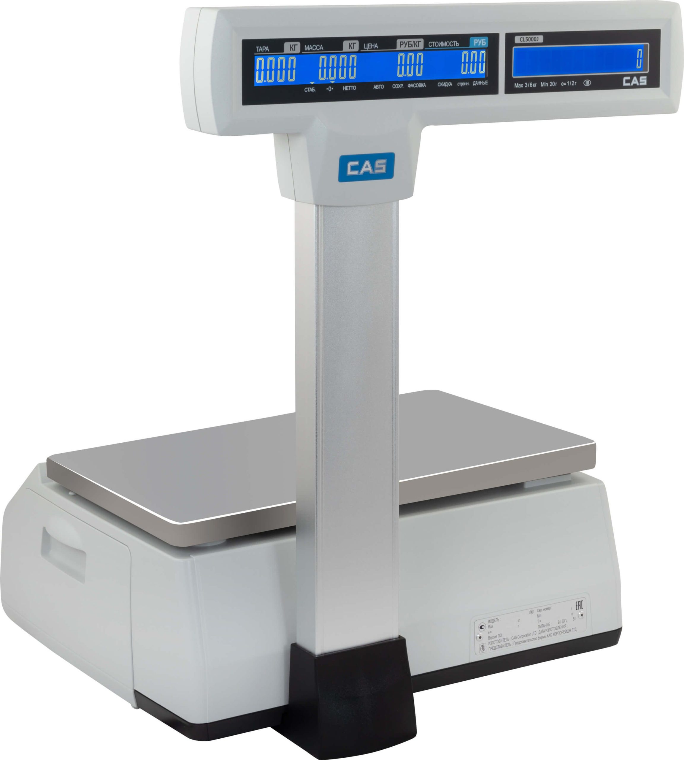 CAS CL5000J-IP – весы с печатью этикеток с дисплеем на стойке. CAS CL5000J-IP – модель, сокращенная по функционалу, но улучшенная по характеристикам в сравнении с CAS CL5000-IP.Своевременно появились на рынке в момент, когда Retail стал увеличивать требования к количеству символов на этикетке. У CAS CL5000J-IP динамическое распределение памяти – количество PLU варьируется в зависимости от количества символов в составе. При максимально заполненном поле «Состав» (1050 символов) 900 PLU, при пустом поле «Состав» (0 символов) – 6000 PLU. Доступна масштабируемость шрифта с учетом максимальной длины этикетки до 80 мм. Жидкокристаллический дисплей. Интерфейсы RS-232, Ethernet установлены по умолчанию, опционально CL5000J можно оснастить модулем WiFi. CL5000J-IP имеют съемный картридж для заправки ленты этикетки. Обновление внутреннего ПО – через RS232. Несовместимость протоколов обмена с весами серий LP и CL5000. Основная сфера применения весов CAS CL5000J-IB – сетевой продуктовый ритейл, а также пищевое производство с необходимостью маркировки продукции.