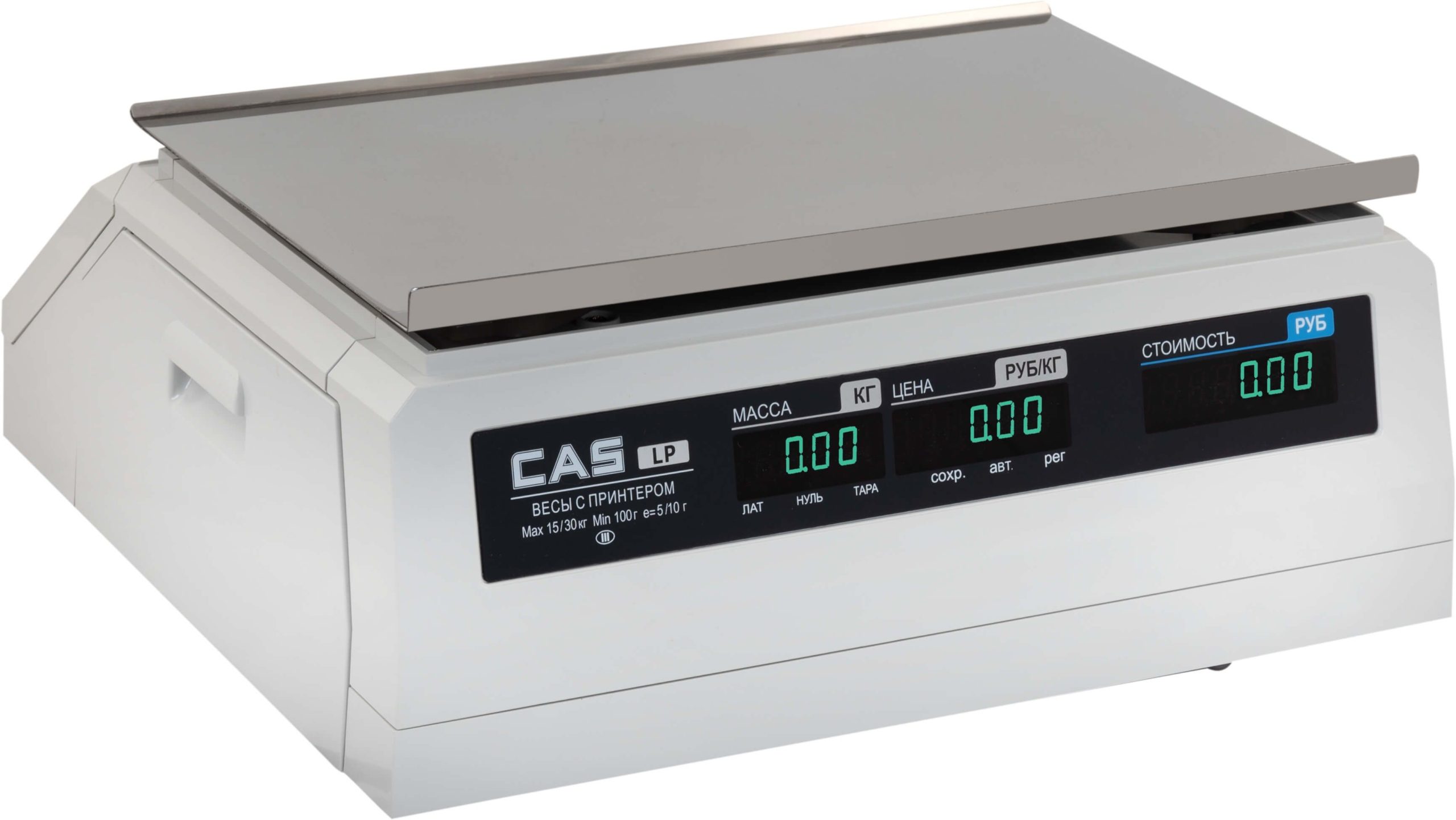 CAS LP - самые первые весы с печатью этикетки от CAS Corporation, появившиеся в России. Модификация LP – без стойки. 3 дисплея (вес, цена, стоимость) расположены на корпусе спереди и аналогичные дисплеи сзади. CAS LP оснащены долговечным металлическим японским принтером со сроком службы более 7 лет - ременная передача обеспечивает минимальный шум при печати и минимальный износ деталей принтера. Память на 4000 PLU (товаров). Разные размеры этикеток (30х58 мм, 40х58 мм, 60х58 мм, 90х58 мм). Доступны следующие поля на этикетке: 2 поля названия товара (по 28 символов), 2 поля названия магазина (по 28 символов), логотип пользователя или РСТ, вес, цена, стоимость, дата, время, срок хранения, штрихкод формата EAN13, 8 текстовых строк состава товара по 50 символов. Интерфейс RS232 по умолчанию в комплекте, Ethernet опционально. CAS LP пользуются спросом у небольших магазинов и кулинарий, на пищевом производстве для фасовки и маркировки готовой продукции.